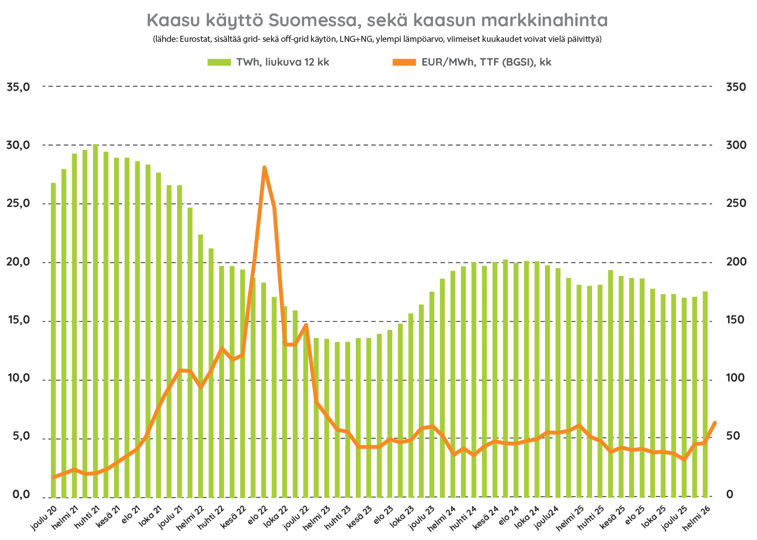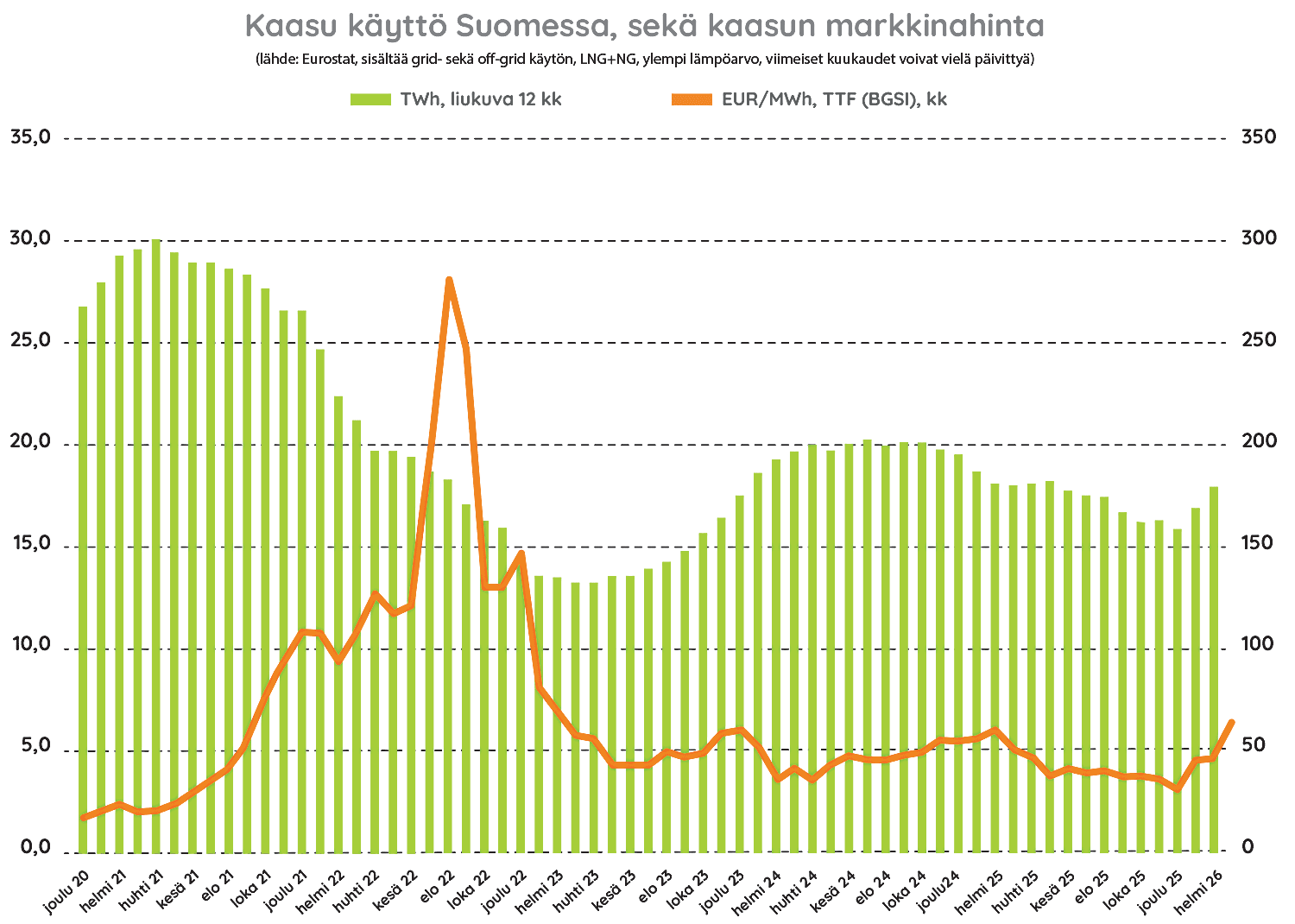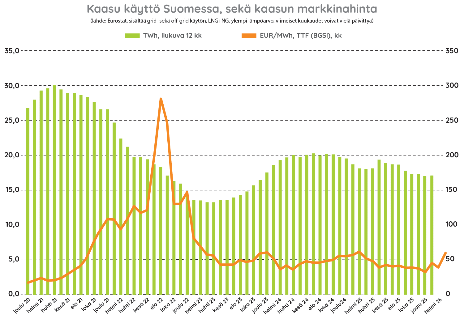 Kaasu yhdistää energiatoimijat ja tuotantomuodot. Energiaa on tarjolla juuri silloin, kun sitä tarvitaan ja siellä missä sitä tarvitaan: teollisuudessa, liikenteessä tai kodeissa. Kotimaisen kaasun hintakin on kilpailukykyinen. Toimitusvarma kaasu vastaa myös tuleviin energiatarpeisiin.